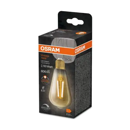 Die Osram Vintage 1906 LED E27 Edison Fadenlampe Gold 7.2W 806lm - 824 Extra Warmweiß | Ersatz Für 60W ist eine effiziente E27 LED-Lampe mit Retrodesign und der perfekte Ersatz für Ihre konventionellen 60W Lampen mit E27. Zudem strahlt sie Licht in der Farbtemperatur 2400K - Extra Warmweiß aus und punktet durch eine lange Lebensdauer.